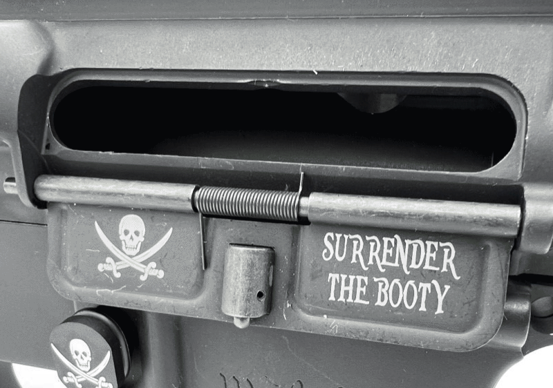 Custom engraved AR ejection port dust covers are the perfect way to show off your rifle, or rekindling some love for your favorite one. These AR15 Dust Covers are conversation starters at your local range every time you go shooting. Jolly Roger Pirate Surrender The Booty engraved ejection port door shows off your American patriotism with flair. This custom engraving is done on both sides. Atomic Engraving is focused in creating some of the greatest looking AR-15 dust covers available to the public. Our AR15 dust cover designs are sure to turn heads. We laser engrave these AR15 ejection port dust covers adding a permanent, rust proof image on your rifle. Don’t settle for the inferior covers that do not look sharp and clear. Get the best of the best from Atomic Engraving.